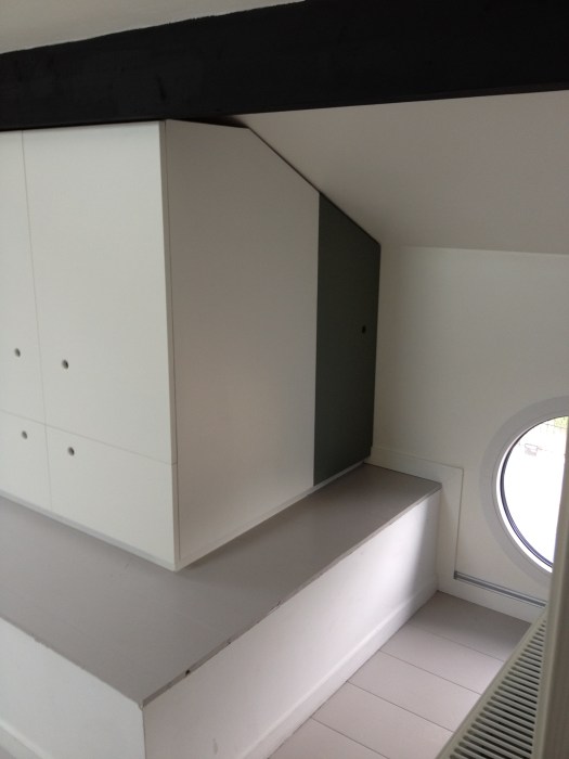 Kitchen in a house renovation. Dinard, France. Materials : Painted MDF, Formica and oak countertops, Formica kitchen facades, oak shelving, painted pine separation shelving