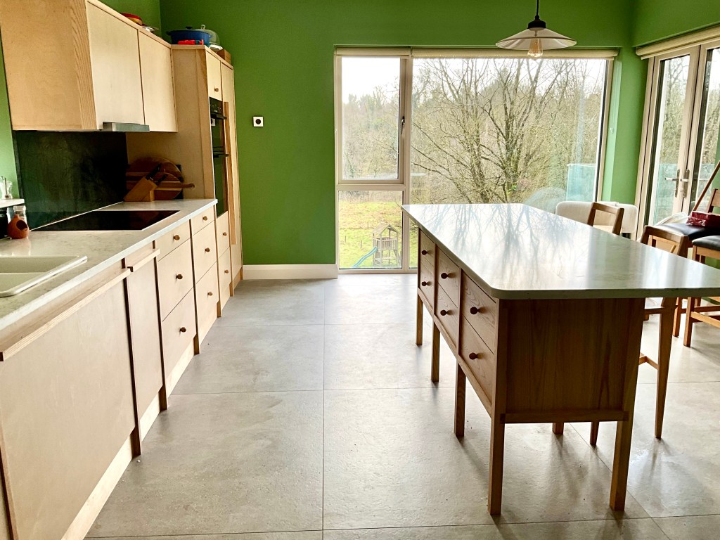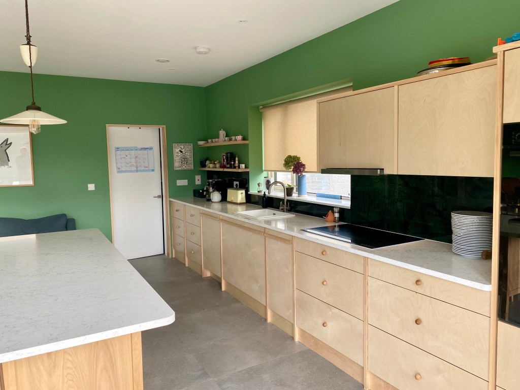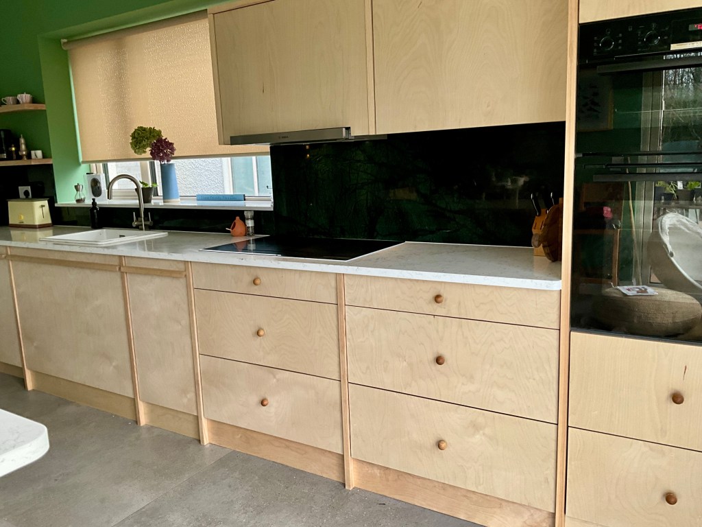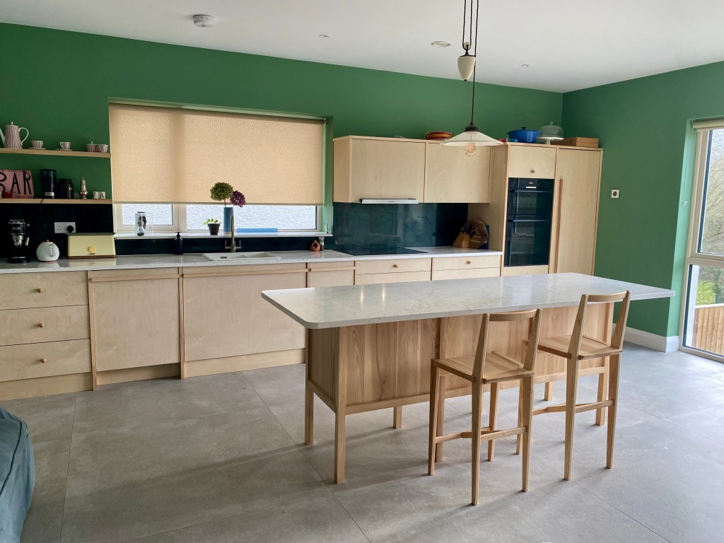 Kitchen in Kilkenny, Ireland. Materials : Birch plywood, solid ash, Arabetto quartz, Rajasthan green marble